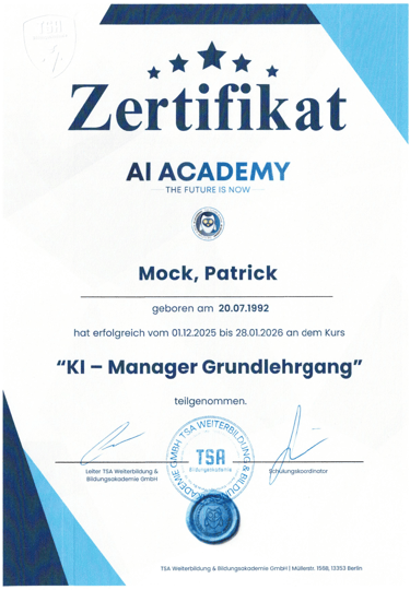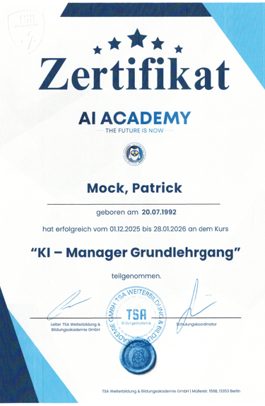In der Industrie sorgen schlaue Abläufe dafür dass alles reibungslos läuft. Ich habe es mir zur Aufgabe gemacht diese Logik in deinen Handwerksbetrieb zu bringen. Um dies optimal umzusetzen habe ich eine Fortbildung im Bereich KI-Management gemacht. Die Fortbildung hilft mir dabei meine eigenen Prozesse so schlank zu halten, dass ich mehr Zeit für meine Familie und meine Hobbys habe.